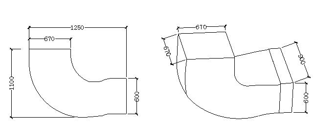 時(shí),室內(nèi)出風(fēng)口的標(biāo)準(zhǔn)尺寸為900*600(mm),出風(fēng)口的面積一般不能小于0.45m2,(特殊情況除外),風(fēng)管彎頭示意圖如下: