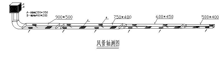 ★      送風(fēng)管的設(shè)計(jì)規(guī)格要保證主風(fēng)管的風(fēng)速低于12m/s,支風(fēng)管風(fēng)速低于12m/s,最未端風(fēng)管的風(fēng)速低于6m/s;與整機(jī)連接的彎頭和第一段送風(fēng)管通風(fēng)截面積不能小于整機(jī)出風(fēng)口的截面(0.45 m2)即送風(fēng)管第一段截面尺寸為900*500; 設(shè)計(jì)的風(fēng)管應(yīng)取直,避免不必要的拐彎和分支管,以減少管道局部阻力;從平面布置和經(jīng)濟(jì)的角度上考慮,能不用風(fēng)管的地方盡量不用風(fēng)管,必須使用風(fēng)管的地方盡量把風(fēng)管設(shè)計(jì)短些;較長(zhǎng)管道根據(jù)風(fēng)量設(shè)計(jì)成多段不同規(guī)格的風(fēng)管,采用變徑連接,變徑管的設(shè)計(jì)不宜過(guò)多,一般整根不超過(guò)四段.風(fēng)管初次變徑為900*500、第二次變徑為750*480、第三次變徑為600*450、第四次變徑為500*400。如下圖所示: