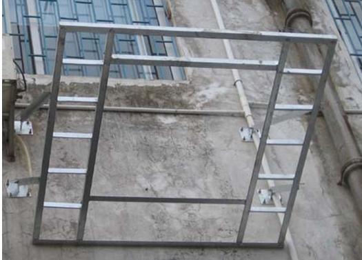 2、將鐵架的一面固定在墻上,(一定要用水平尺測(cè)量是否平衡)之后在上爆炸螺絲,最后安裝兩邊的拉桿。