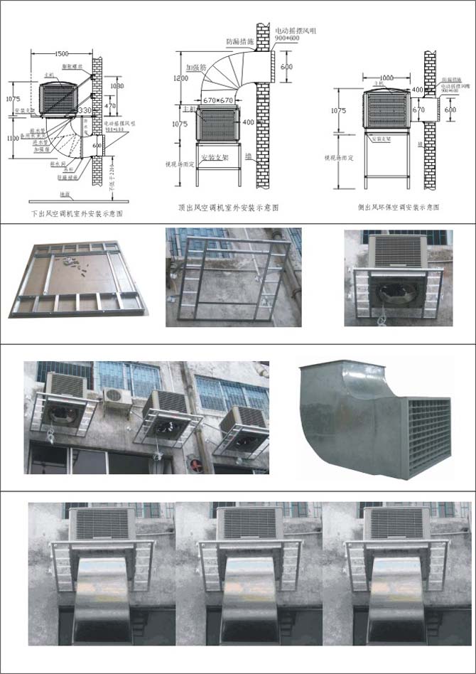 6、 以下為下出風(fēng)、頂出風(fēng)和側(cè)出風(fēng)機(jī)型標(biāo)準(zhǔn)安裝圖及尺寸,具體安裝方式應(yīng)視現(xiàn)場(chǎng)而定,工作如下圖所示:
