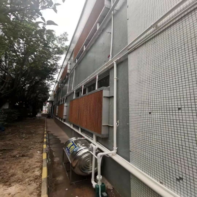 2、騰煌水簾風機降溫方案,此方案適用于封閉性好且產(chǎn)品對濕度要求不高的生產(chǎn)車間。在車間安裝負壓風機,在對面或側面安裝降溫水簾,負壓風機把車間內(nèi)高溫悶熱空氣快速排出,使車間內(nèi)形成負壓,迫使車間外空氣經(jīng)過降溫水簾降溫后補入室內(nèi)達到通風降溫的效果,注意水簾風機降溫需要做好車間的密封,盡量保證進入車間的空氣經(jīng)過降溫水簾。